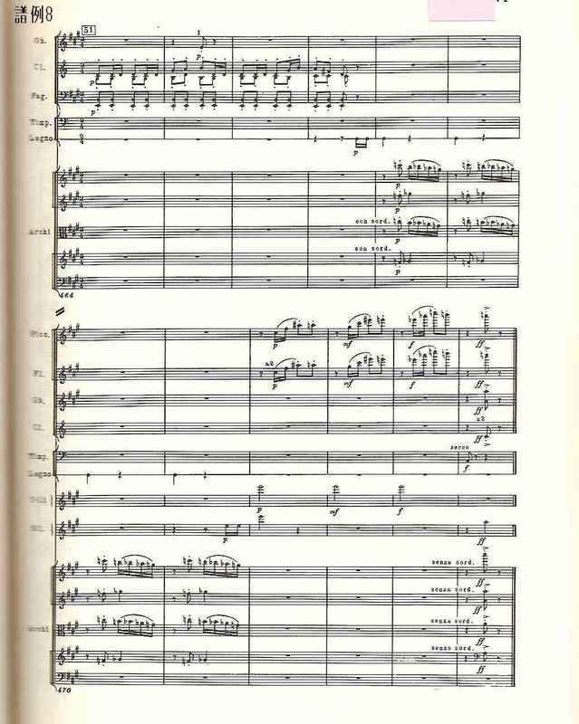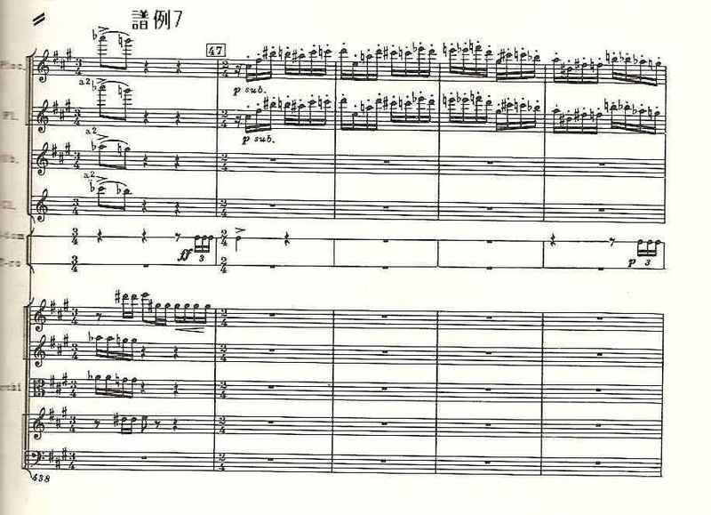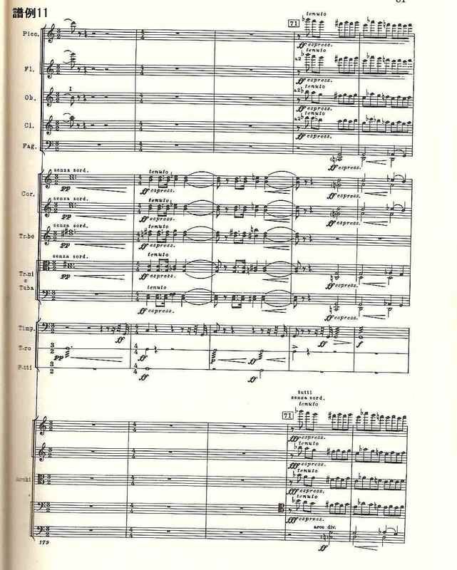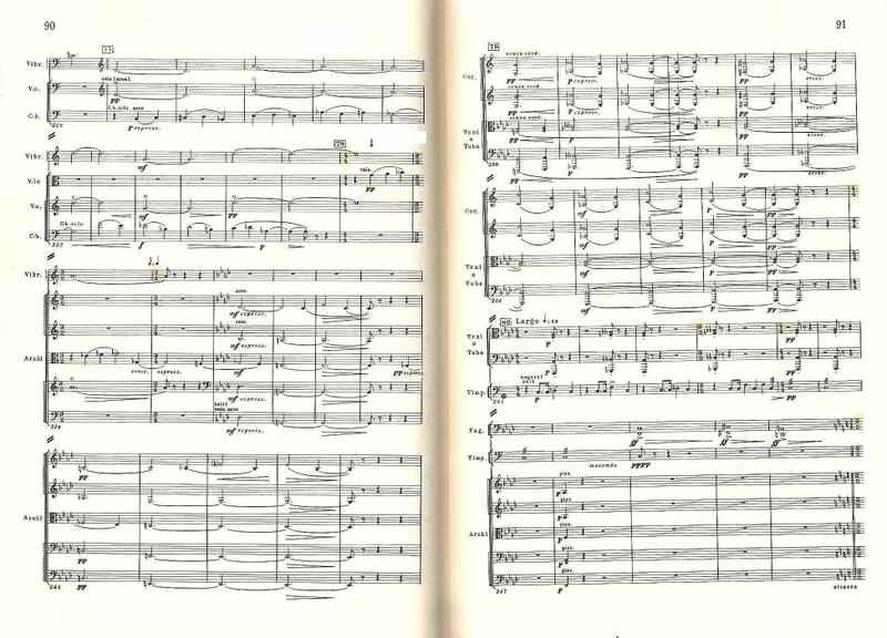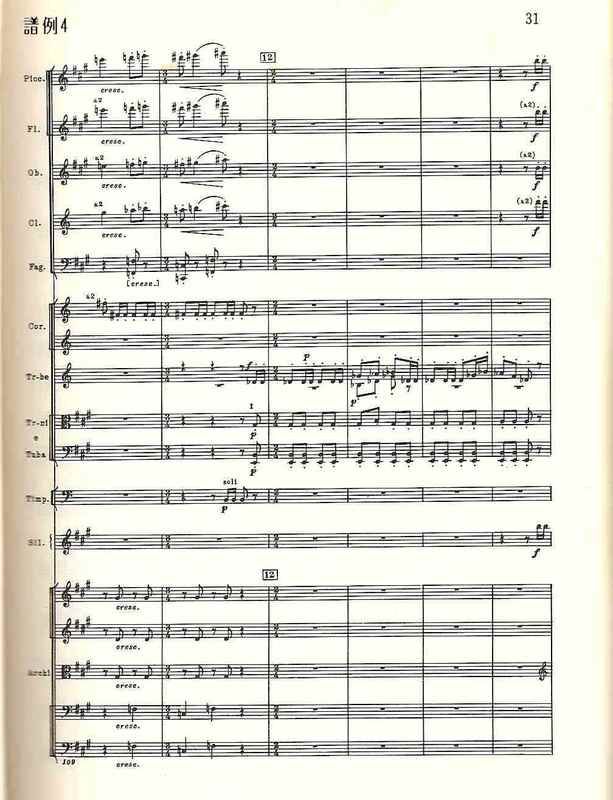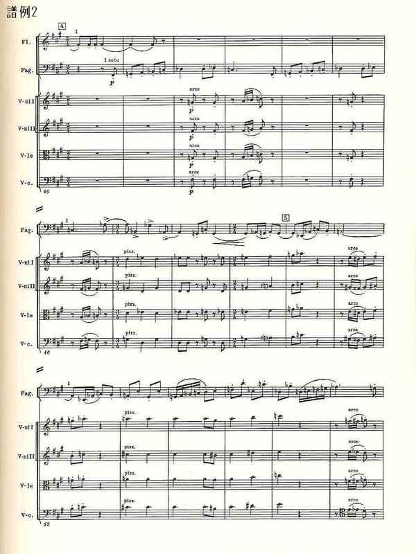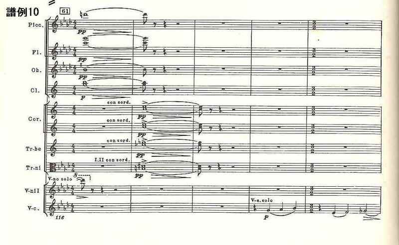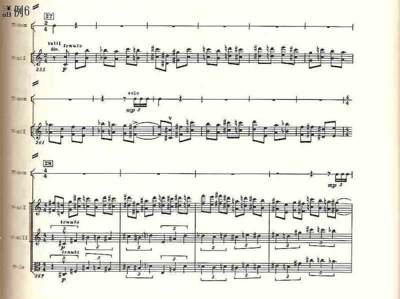 曲第5番」でと同様、17~32小節、53~72小節、98~126小節、147~168小節は、その直前の楽器の編成を変えたほぼ正確な反復で、スケル ツォのダ・カーポでは、反復の省略まで作曲されている。12音音列、マーラーのレントラー、打楽器アンサンブル、変拍子。さまざまな楽器のソロからなる手の切れそうな鋭利な音楽は、出発点と同じg音できっぱりと終わる》