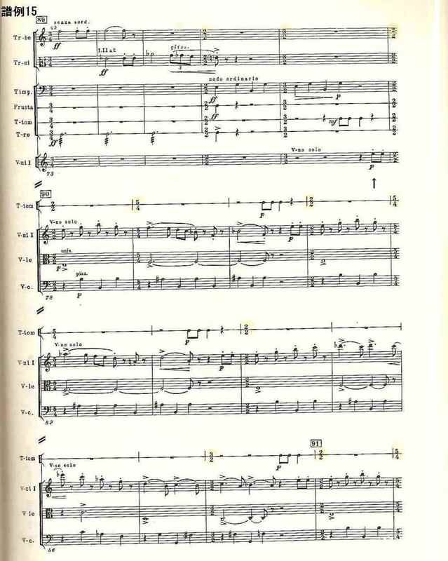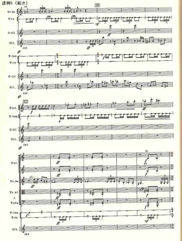 再現部は短いが、ここでは終楽章の終り、つまりこの交響曲全体の終りで執拗に繰り返される無機質な打楽器によるリズムの“予告”が行われる(譜例16)。この打楽器の不思議な刻印は、ショスタコーヴィチのメッセージのようなもので、第4交響曲やチェロ協奏曲第2番にも顔を出している。