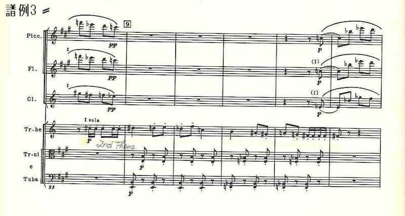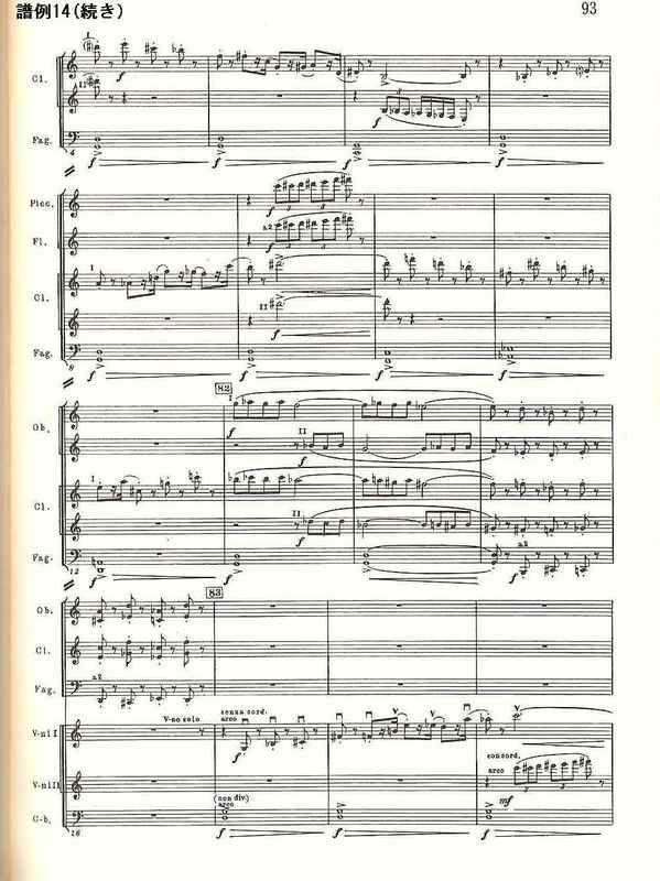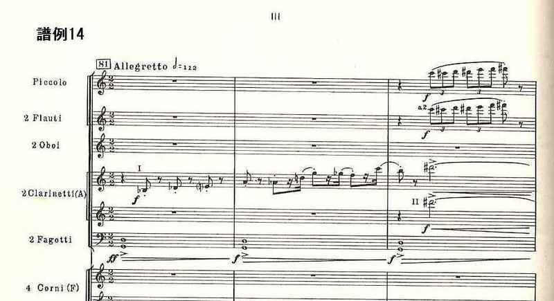 骸骨の踊りを思わせるようなスケルツォで、雰囲気的に第1楽章の主題をも思い起こさせる。前楽章のファゴットによるffの3音からアタッカで始まるこの楽章だが、いきなりクラリネットによって第1主題が吹かれる。これは上行する12音と続く下行する12音でできている(譜例14。掲載したスコアは全音楽譜出版社のもの。以下同様)。