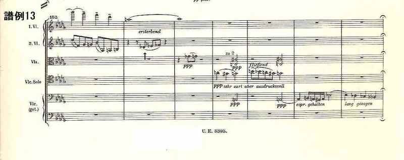 鋭いが、しかし気の抜けたようなトランペット、トロンボーンのファンファーレによってトリオ(中間部)に入る。ここでソロ・ヴァイオリンが新しい主題を弾く(譜例15。新しい主題は矢印の部分)。