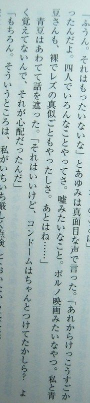 「ぼくはその子と自然に交わった。性交するなんて簡単なことなのだ。でも、もちろんその前にコンドームをつけた。つけるのは自分でした。少し薄暗かったのできちんとペニスにかぶせるのに手間取ってしまった。やれやれ」なんてことは書かれていない。