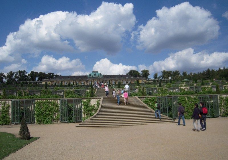 「プロイセン国王フリードリヒ2世の夏の離宮であったロココ様式の宮殿。1745年から約2年をかけて建てられた。サンスーシとは「心に憂いがない」という意味。広大な庭園には新宮殿や中国茶館など、見どころは多い」と、ガイドブックには書いてある。世界遺産。