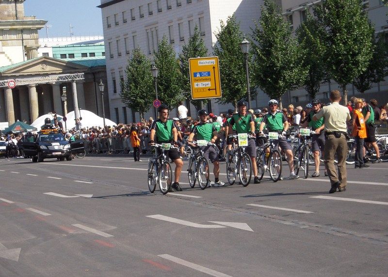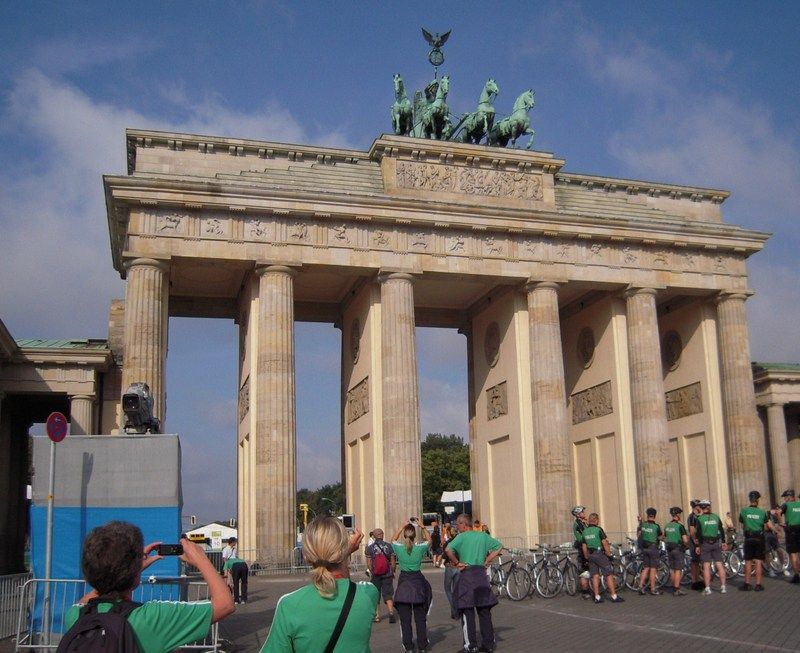おやおや、警備にあたるグリーンのシャツを着た警察官たちが門をバックに記念撮影をしている。きっとこの日のためにドイツ国内のあちこちから駆り出されてきたのだろう。