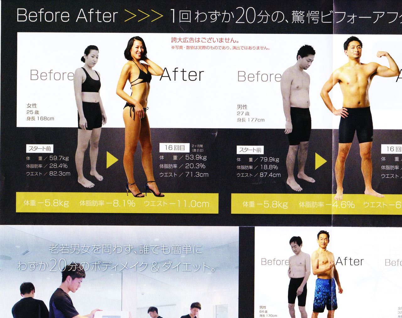 フィットネスの効果を誠意をもって訴えたいのなら、ビフォーとアフターの姿勢や表情を一緒にすべきだと。