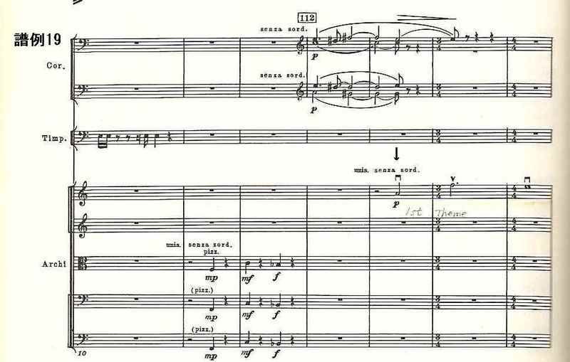 14小節目から第1ヴァイオリンによって主要主題(第1主題)がpで弾かれる(譜例19の矢印箇所)。この最初の3音が、ワーグナーの「トリスタンとイゾルデ」の冒頭を暗示していると言われているものである。第1楽章のブログのときに書いたが、これは