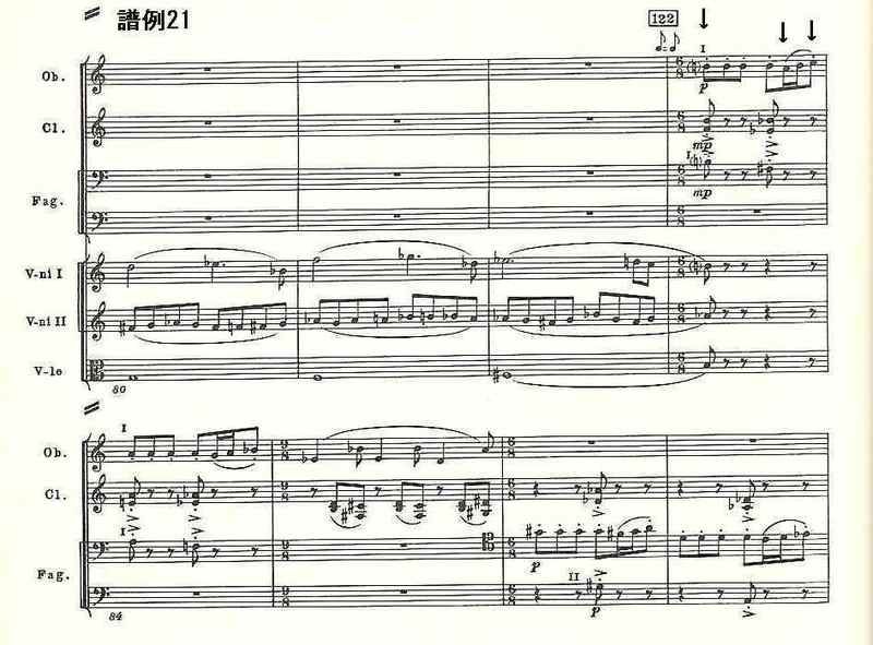64小節目からオーボエが吹く旋律が副主題(第2主題)である。胸を締めつけるような寂しさに満ちたものであるが、森氏が書いているそのあとの「不思議な8分の6拍子」(譜例21)の経過句について、作曲家の諸井誠氏は「ここにも“運命の動機”からの循環が聴かれる」と書いている。確かに、矢印で示した3つの音が“運命の動機”を形づくっている。
