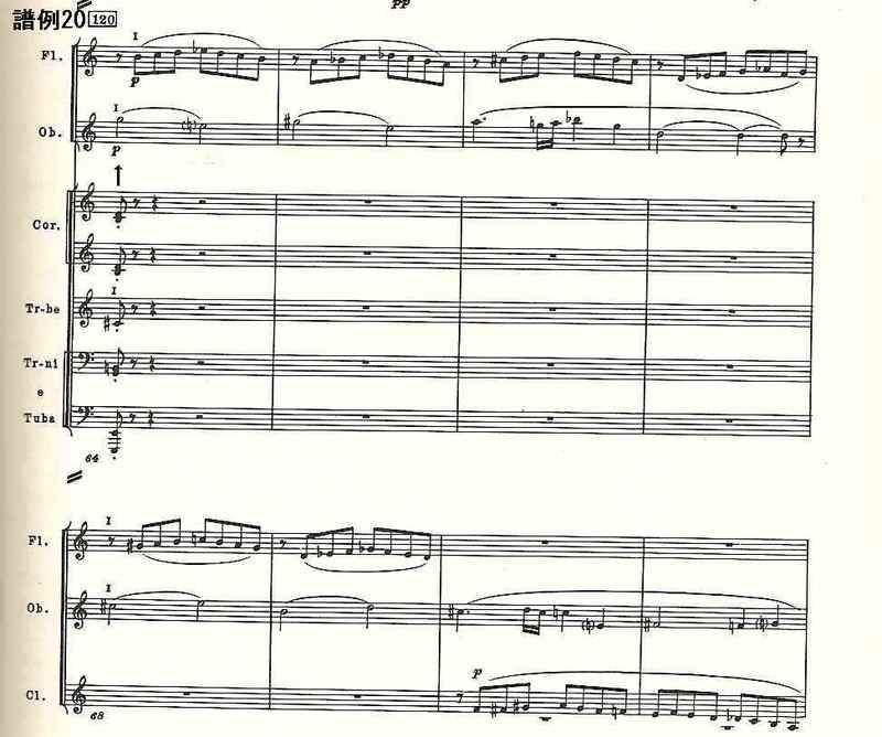そのあとに「やがてすべてはe音に吸収され」という部分になり(譜例22)、第1部が終わる。