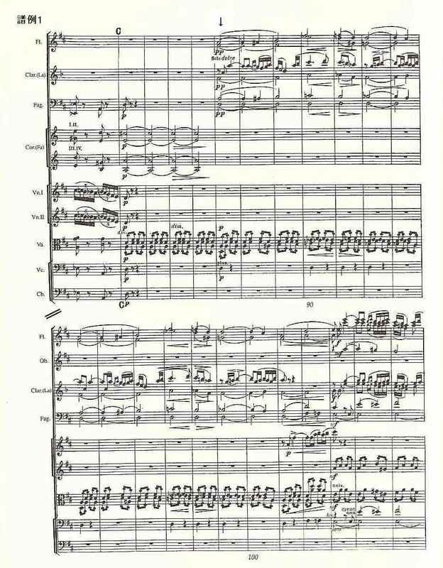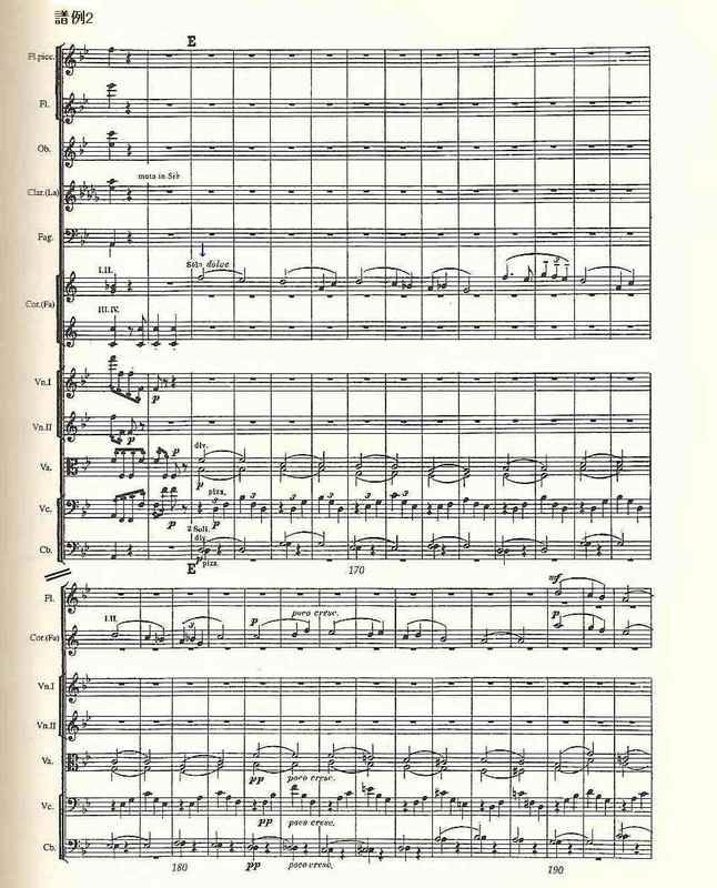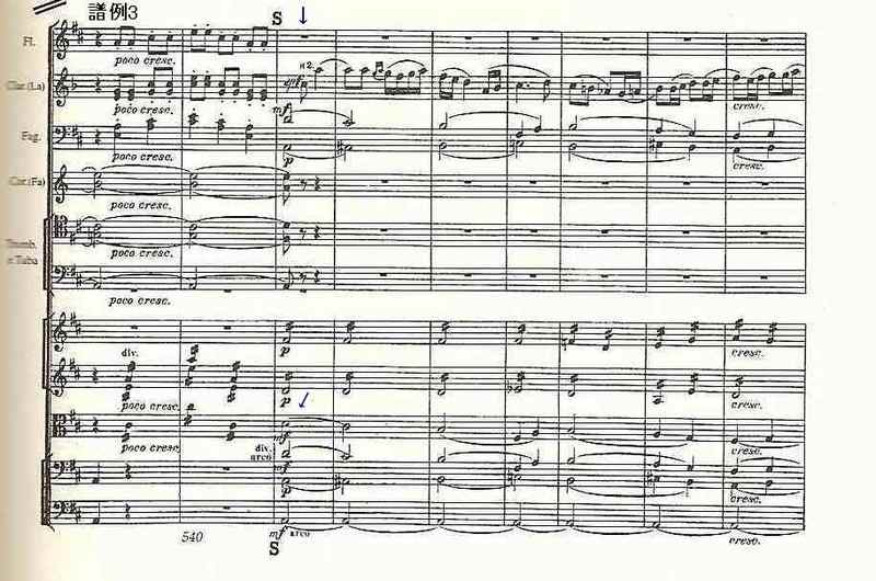 曲の開始まもなくで現れる、クラリネットによる躍動的な旋律(譜例1の矢印部分。掲載したのは全音楽譜出版社のスコア。以下同)と、ホルンによる牧歌的な旋律(譜例2の矢印部分)。これが曲の終りには同時に進行するが(譜例3の2つの矢印)、これだけで私は喜びは100%である。こんな幸せな感動がほかにあるだろうか!(たぶんある。それに「不幸な感動」っていうのもない。)