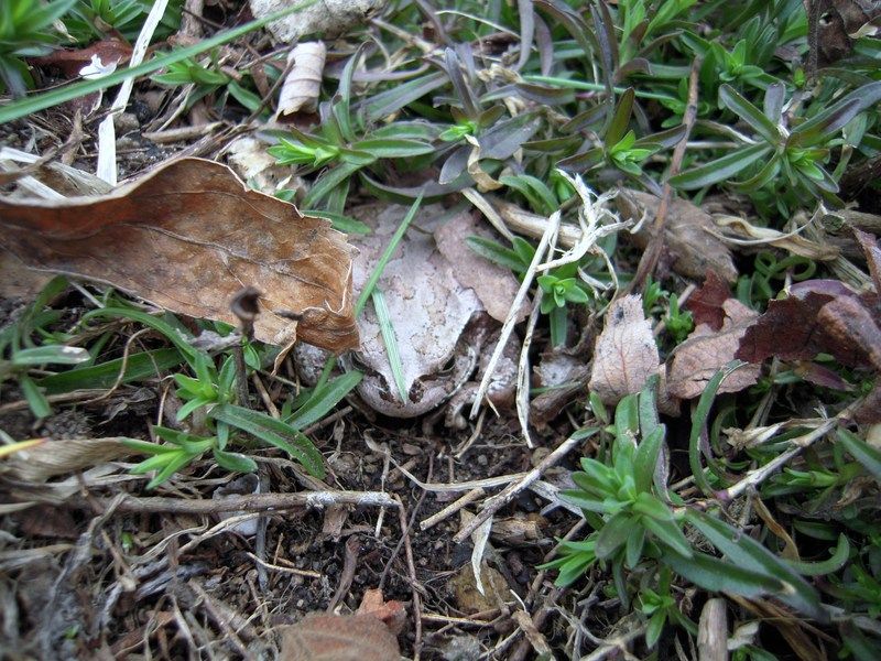 枯れ葉を拾っていると、おや?、その下に冬眠中のカエルちゃんがいるではないか!