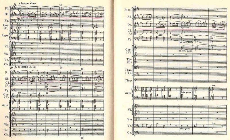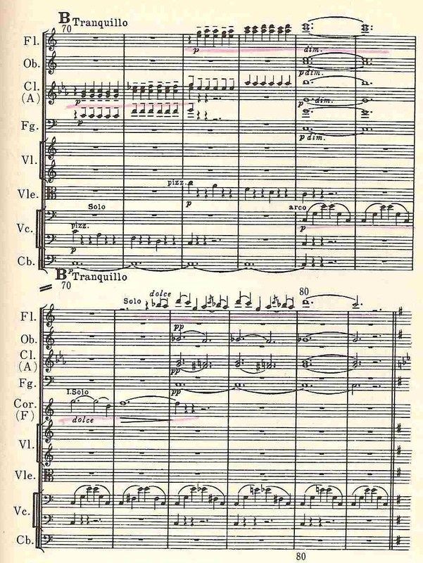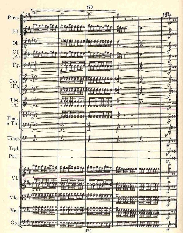 第2楽章のオーボエのメロディーに萌え(2番目の楽譜)、それから、(これはもちろんスコア=3番目の楽譜を見て初めて知ったのだが)「1小節の中にこんなにオタマジャクシ(音符のこと)がある。まるで、春先にピクニックにいったときに見た山のふもとの水たまりのようだ」との連想を抑えきれない光景(つまり卵からオタマジャクシがかえって、うじゃうじゃ泳いでいるわけ)。さらには、強烈な一打でビシっと終わる第2楽章の最後。