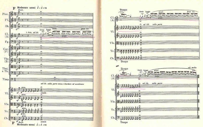そして、第1楽章に現われるクラリネットとフルートによるとても印象的な動機(いちばん上の楽譜。なお、掲載楽譜は全音楽譜出版社のもの)。これを忘れまいと、帰りのバスで頭の中で何回も反芻した(翌朝すっかり忘れていたけど)。