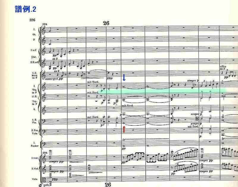 譜例.2に示したメロディーがそれだが(掲載譜は音楽之友社(フィルハーモニア版)のスコア)、ほとんどの演奏では、ファンファーレの第4音は青矢印の音を強調している。しかし、ラインスドルフは赤矢印の、下降するトロンボーンの音を前面に聴こえるように演奏している。