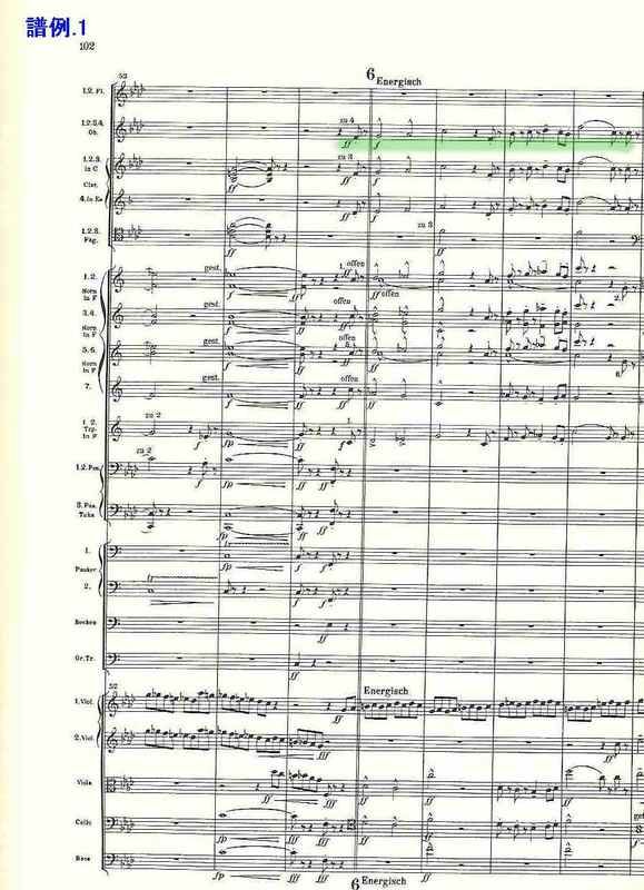 そして私が「目からうろこ、耳からサメ肌」状態になったのは、このメロディーが第4楽章第1主題(54小節目。譜例.1)が変形したものにほかならないと気づいたからだ。