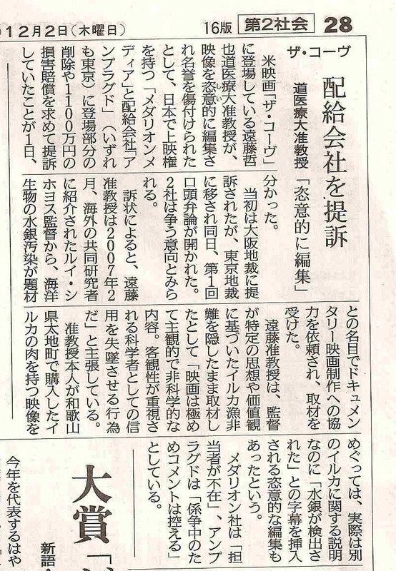 昨日の北海道新聞朝刊に、アメリカ映画「コーヴ」に登場している北海道医療大学の准教授が、映像を恣意的に編集され名誉を傷付けられたとして訴えを起こしたという記事が載っていた。