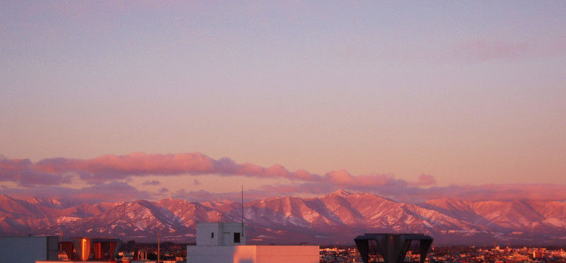 朝焼けで鮭桃色、かっこつけて言うならサーモンピンクに染まった雪まみれの山々である。