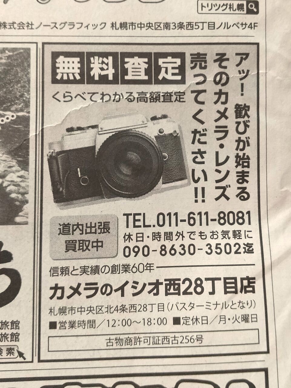 同じく道新にときおり載る、「カメラのイシオ」の広告。